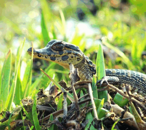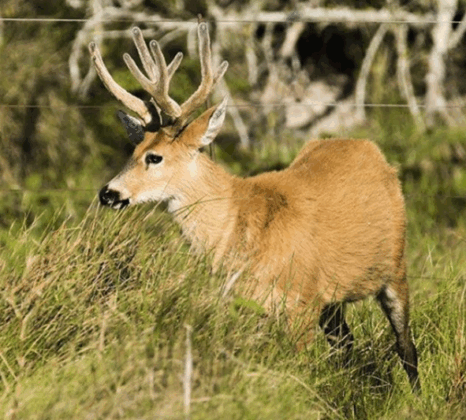El Yacaré es esa especie de cocodrilo. Pueden medir hasta tres mestros, aunque las crías apenas 30 centímetros. Podés verlo junto a los carpinchos. También podés toparte con el zorro del monte, o el zorro gris, aunque salen por lo general al anochecer. Y está la delicada corzuela, sutil y elegante, que se desliza por el verde, y si tenés suerte, también podés cruzar al ciervo de los pantanos, elegante y fuerte, el más grande de los ciervos de América del Sur. Hay videos que lo muestran sumergido en el agua ¿Te lo imaginás?