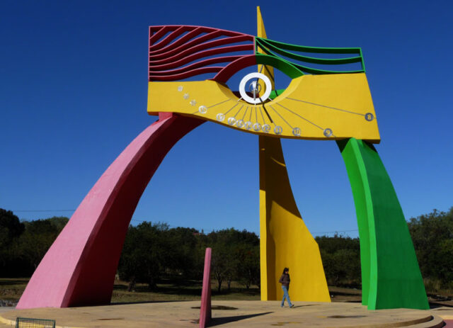 Este monumento colorido le rinde homenaje al Sol y, además, funciona como un reloj gracias a la luz de este astro. Una obra única que requirió de la creatividad del artista Pérez Celis y el esfuerzo del científico Jaime García. Tres pilares de 23 metros cada uno y un inmenso ojo, proyectan la sombra en la base de la escultura, para que los visitantes puedan hacer una lectura, innovadora, del tiempo.